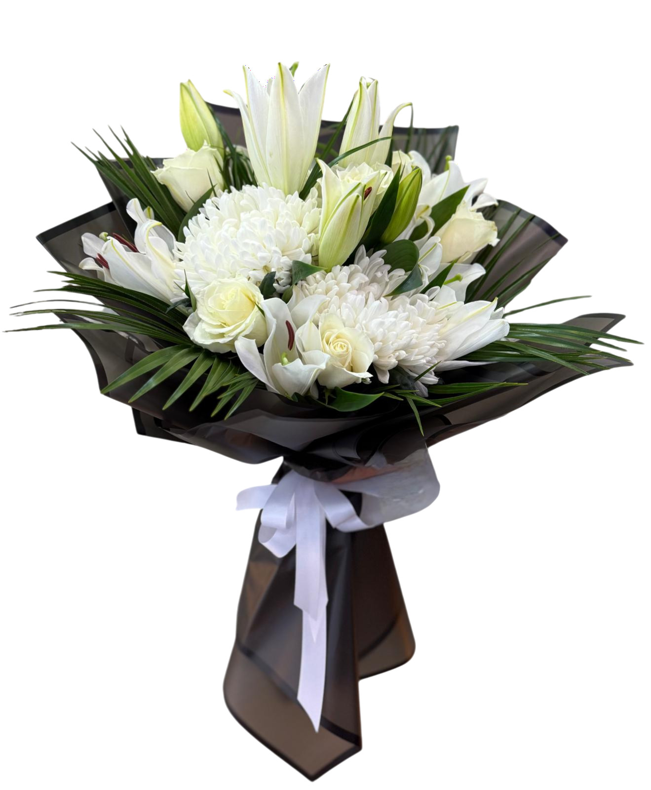 Masumiyetin ve saflığın simgesi bembeyaz çiçeklerden oluşan şık buket.