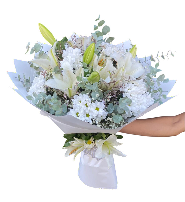 Masumiyetin ve saflığın simgesi bembeyaz çiçeklerden oluşan zarif buket.