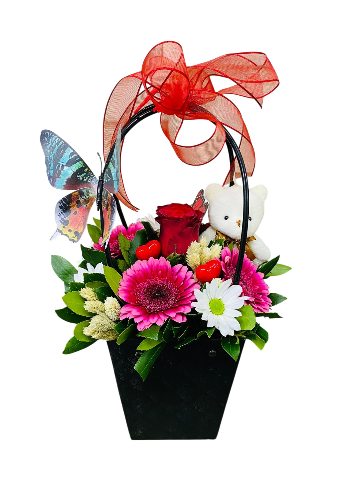 Modern sunumuyla dikkat çeken, çanta içinde aranje edilmiş taze çiçekler.