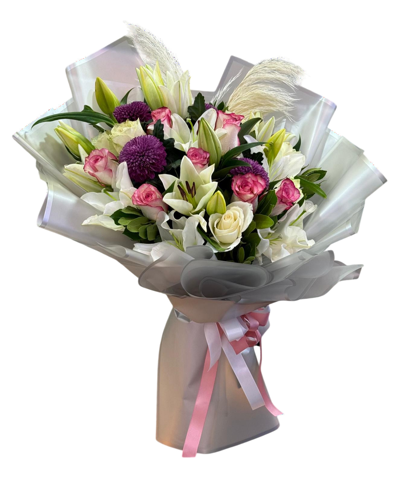 Lilyum kokusuyla büyüleyen, güllerle göz dolduran şık aranjman.