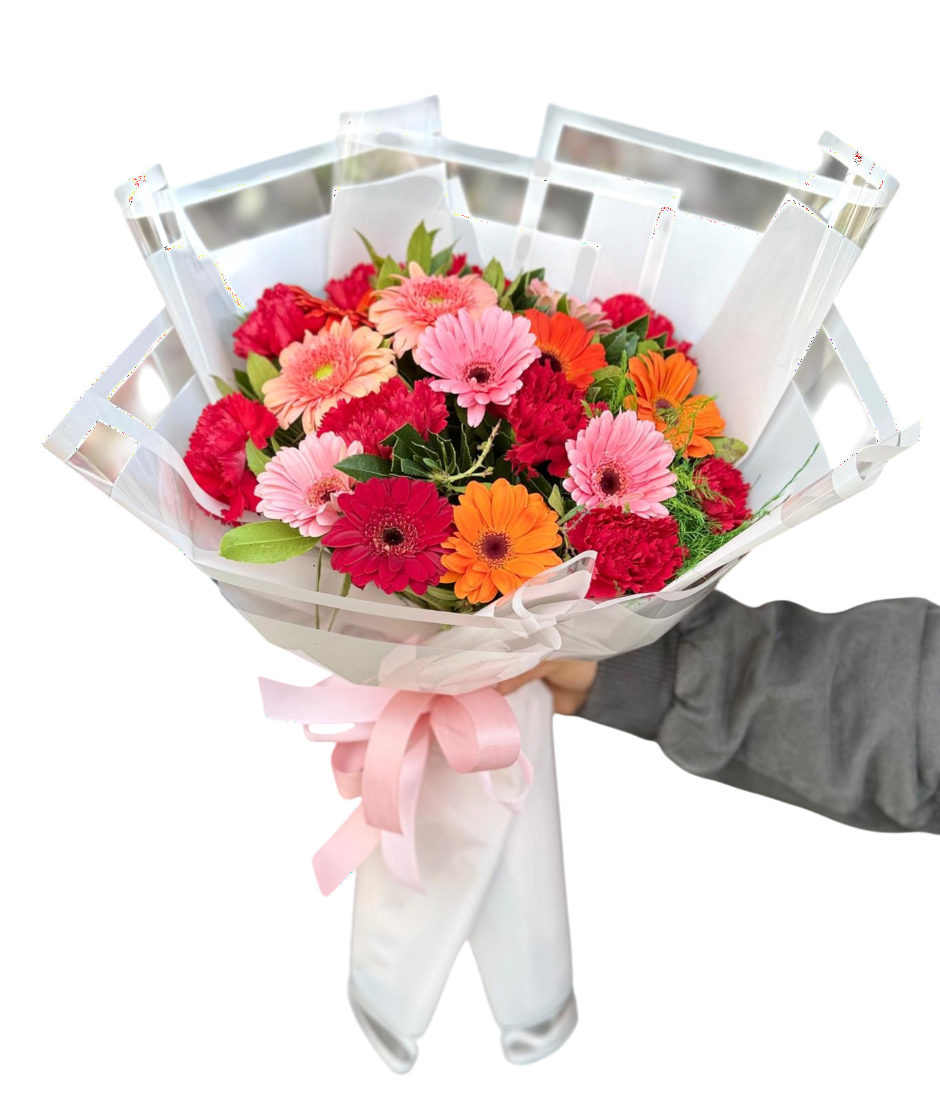 Dayanıklı karanfiller ve canlı gerberaların renkli birlikteliği.