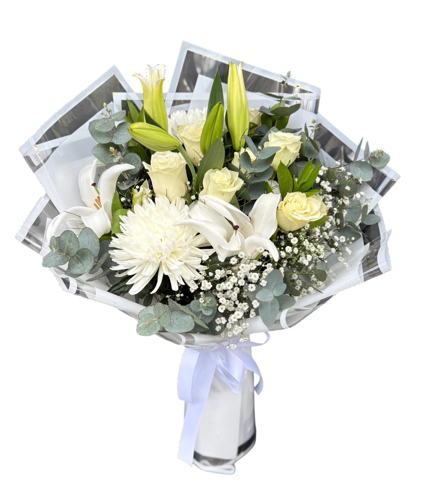 Farklı türdeki beyaz çiçeklerin saflık temasında buluştuğu özel buket.