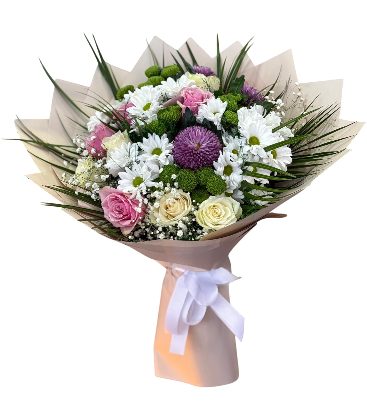 Doğal papatyalar ve asil güllerle hazırlanmış şık bir çiçek buketi.