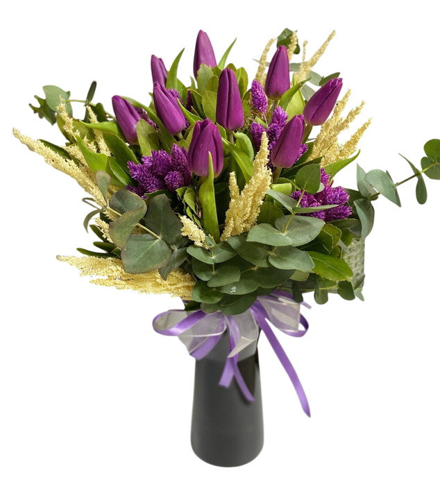 Asil mor lalelerden oluşan, zarafet dolu çok özel bir buket.