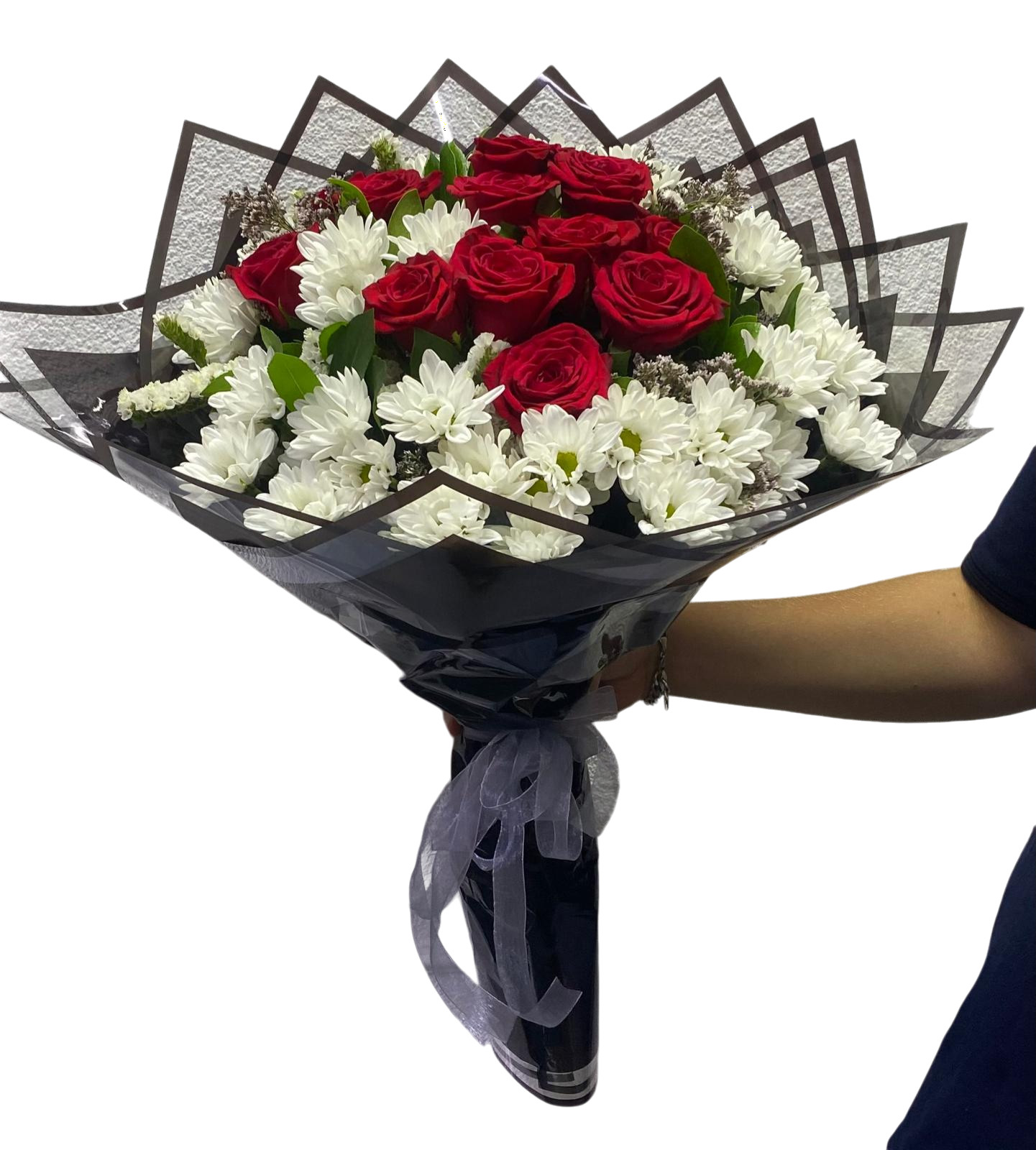 Sade papatyalar ve taze güllerle hazırlanan, sevgi dolu bir sunum.