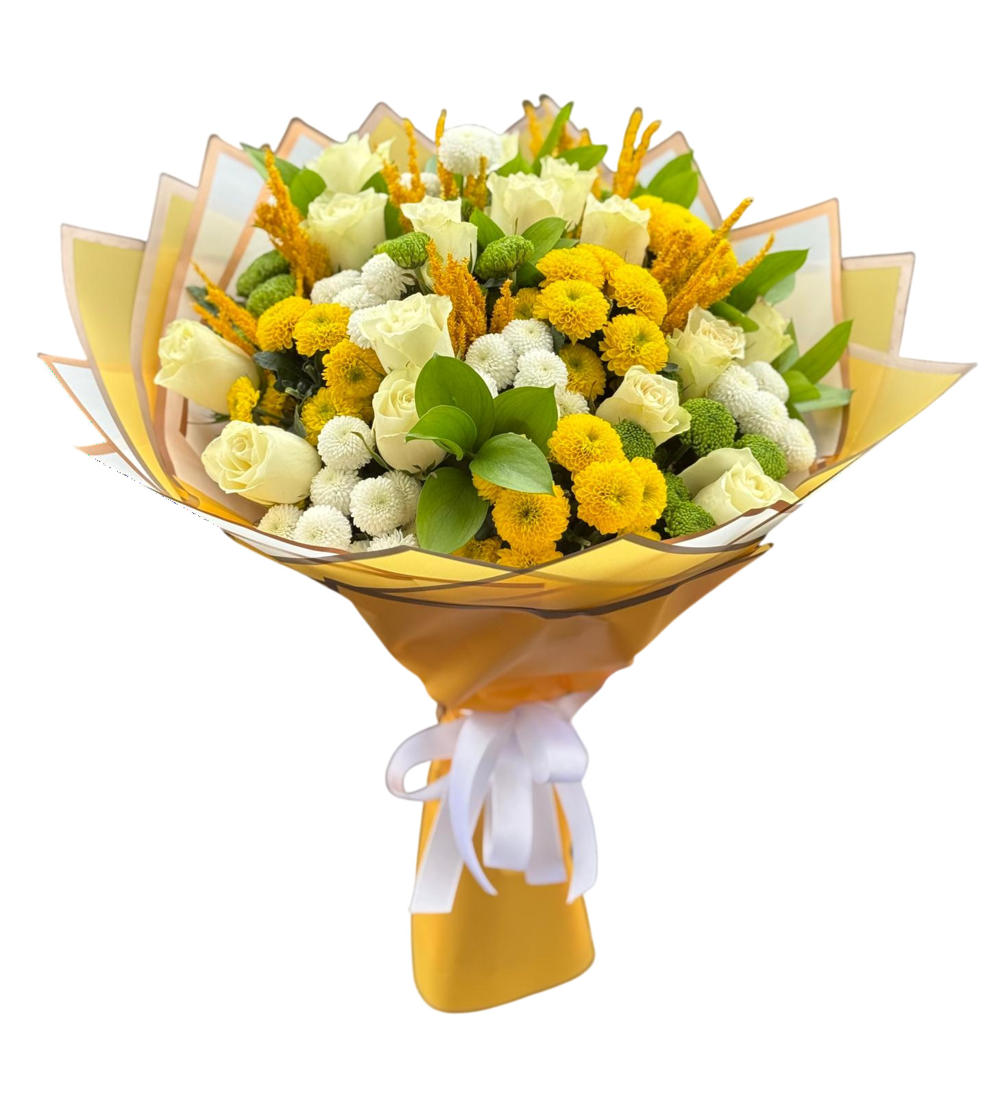 Güneşin sarısı ve beyazın saflığını buluşturan enerjik çiçek buketi.