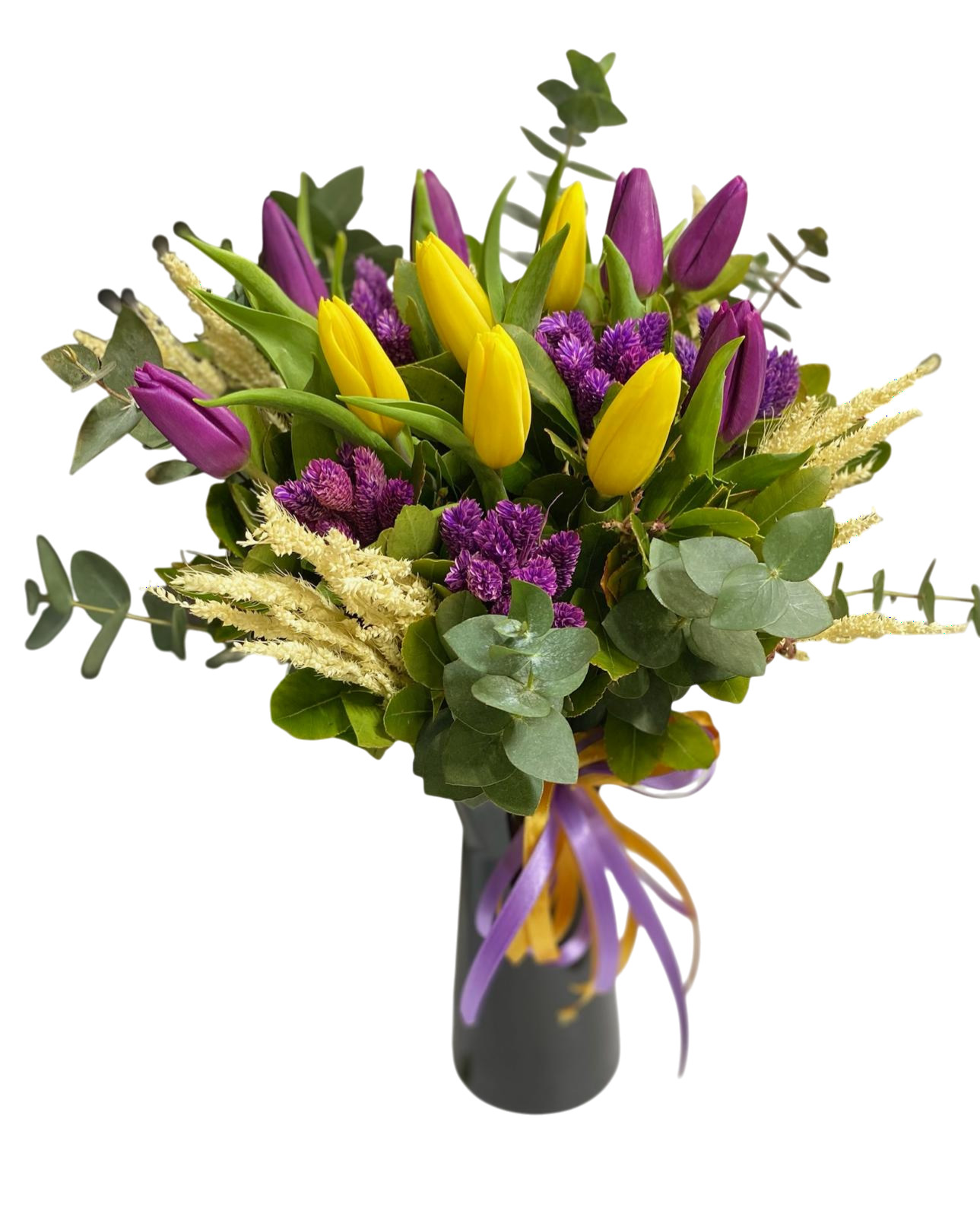 Sarı ve mor lalelerin asil duruşuyla hazırlanan nadide bir buket.